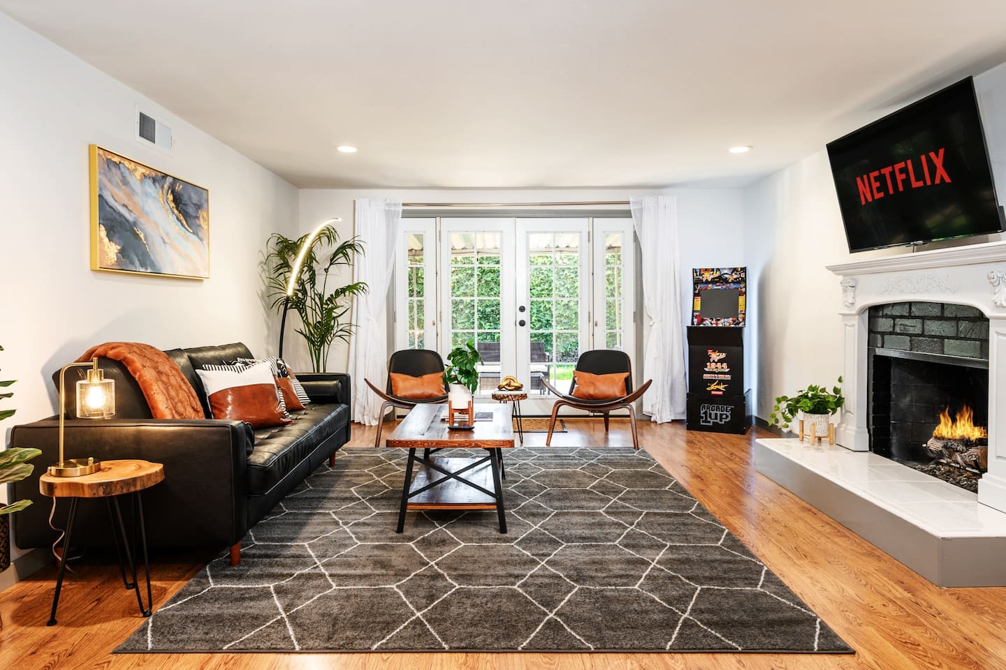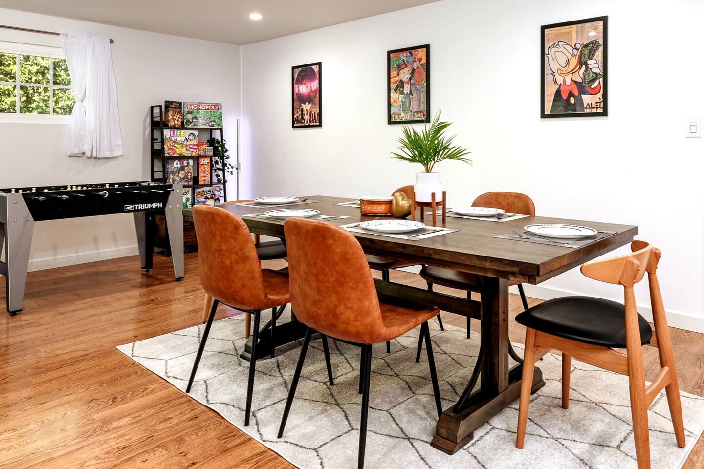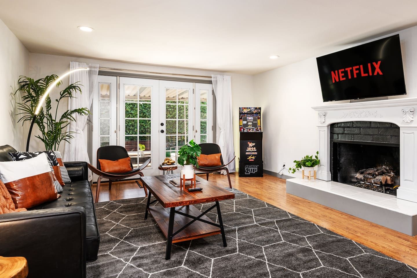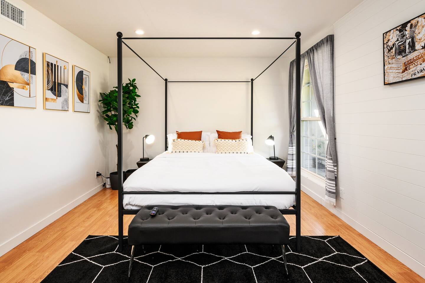 Indulge in the elegance of this exquisite residence, exuding contemporary flair and ample space for the entire family to relish their own moments. Engage in timeless board games, spirited rounds on the arcade machine, or simply unwind with a glass of wine in the outdoor lounge—the epitome of warmth and hospitality awaits to craft lasting memories during your stay. ★ SPACIOUS LIVING ★ Unwind beside the fireplace in the luminous, expansive living area featuring a sumptuous leather sofa and two chic accent chairs. Enjoy endless entertainment with a Roku TV stocked with Amazon Prime Video, Apple TV, Disney+, HBO Max, Hulu, and Netflix (use your personal account), along with a playful arcade machine for youthful spirits. ✔ Plush Leather Sofa ✔ 65" Wall-Mounted Smart TV ✔ Stunning Fireplace ✔ Arcade Machine ★ GOURMET KITCHEN & DINING ★ The chef’s kitchen is a culinary haven, complete with a standalone oven, cooktop, and a generous fridge/freezer with filtered water and ice dispenser. Find top-quality cookware, dinnerware, and utensils, alongside a coffee maker for that perfect start to your day. Gather at the elegant dining table for six, doubling as a game center with a selection of board games and a full-size foosball table for lively competition! ✔ Stainless Steel Appliances ✔ Coffee Maker ✔ High-Quality Cookware & Utensils ✔ Dining for Six ✔ Board Games & Foosball Table ★ BEDROOMS & BATHROOMS ★ Discover four spacious bedrooms, each adorned with luxurious queen beds and floor mattresses topped with soft, high-quality linens. Unpack effortlessly with ample storage space. The two lavish bathrooms are stocked with essentials and plush towels, ensuring a pampered stay. ✔ Bedroom One – Queen Bed & Floor Mattress ✔ Bedroom Two – Queen Bed & Floor Mattress ✔ Bedroom Three – Queen Bed & Floor Mattress ✔ Master Bedroom – Queen Canopy Bed & Floor Mattress & Crib/Pack n Play ✔ Master Bathroom ✔ Central Family Bathroom ✔ Bath Towels ✔ Toiletries Provided ✔ Soap, Shampoo, Conditioner and Bodywash (McKesson Body Wash and Shampoo with Aloe) ★ OUTDOOR RETREAT ★ Bask in the Californian sun in the private grassy yard, relaxing under the shaded patio or engaging in giant connect 4 or cornhole. As twilight descends, gather around the fire pit for marshmallow roasting and captivating stories. ✔ Covered Patio ✔ Outdoor Lounge ✔ Cornhole ✔ Giant Connect 4 ✔ Fire Pit ★ PET POLICY ★ Bring along your furry companion for an additional fee. We warmly welcome one pet, requiring a one-time fee of $200. To ensure everyone's comfort, please ensure your pet is trained and does not shed or damage our furniture. Any damages will incur a replacement fee. Thank you for helping us maintain a delightful experience for all. Please add the pet in the guests count. Whether planning a family vacation or a Disneyland getaway just moments away, look no further than this chic, contemporary haven boasting unparalleled style and a plethora of amenities for an unforgettable stay.