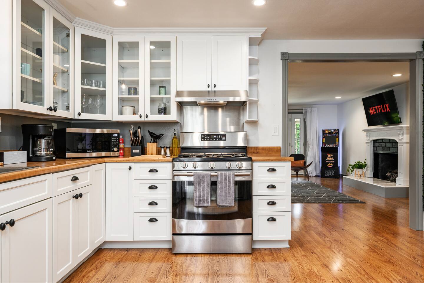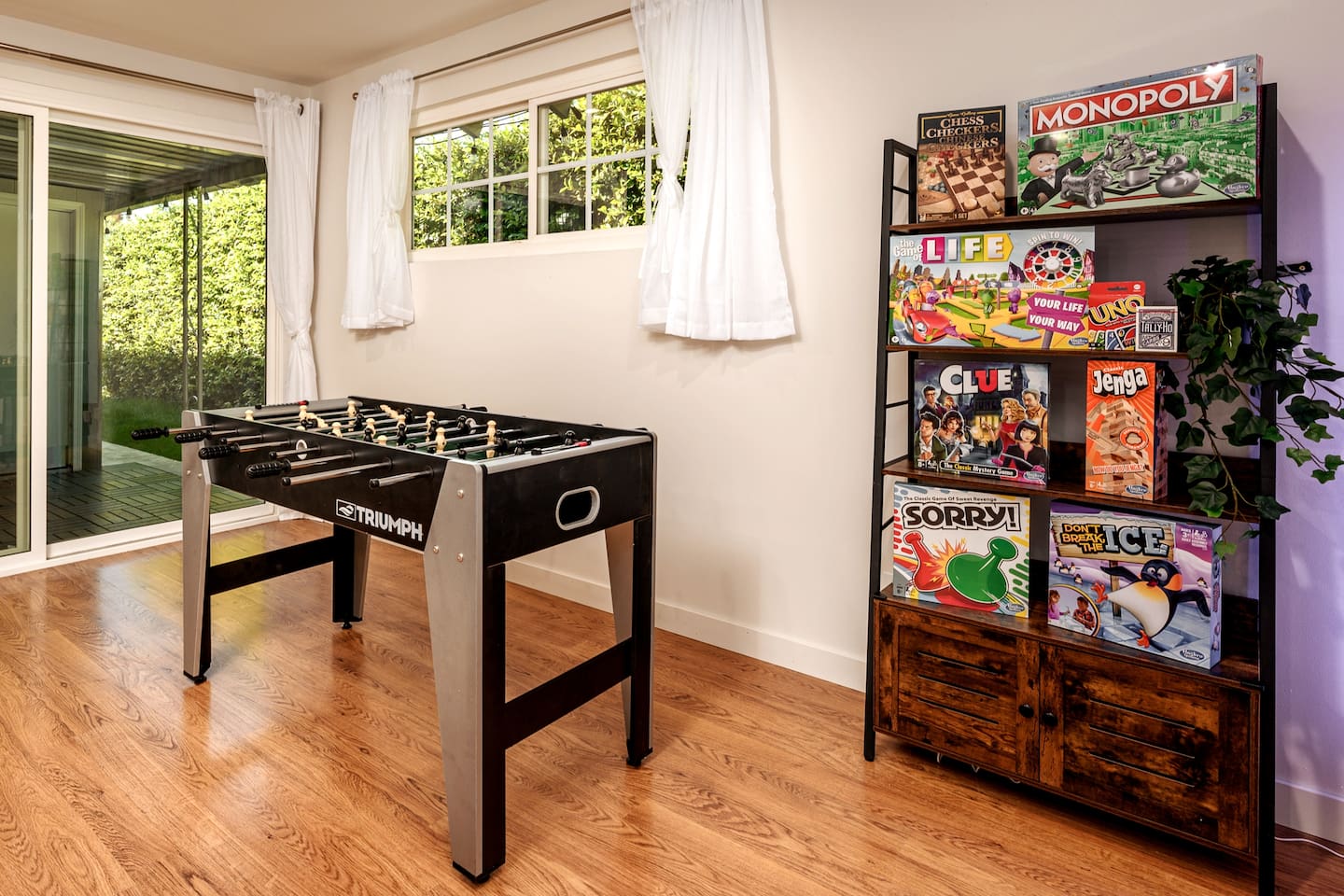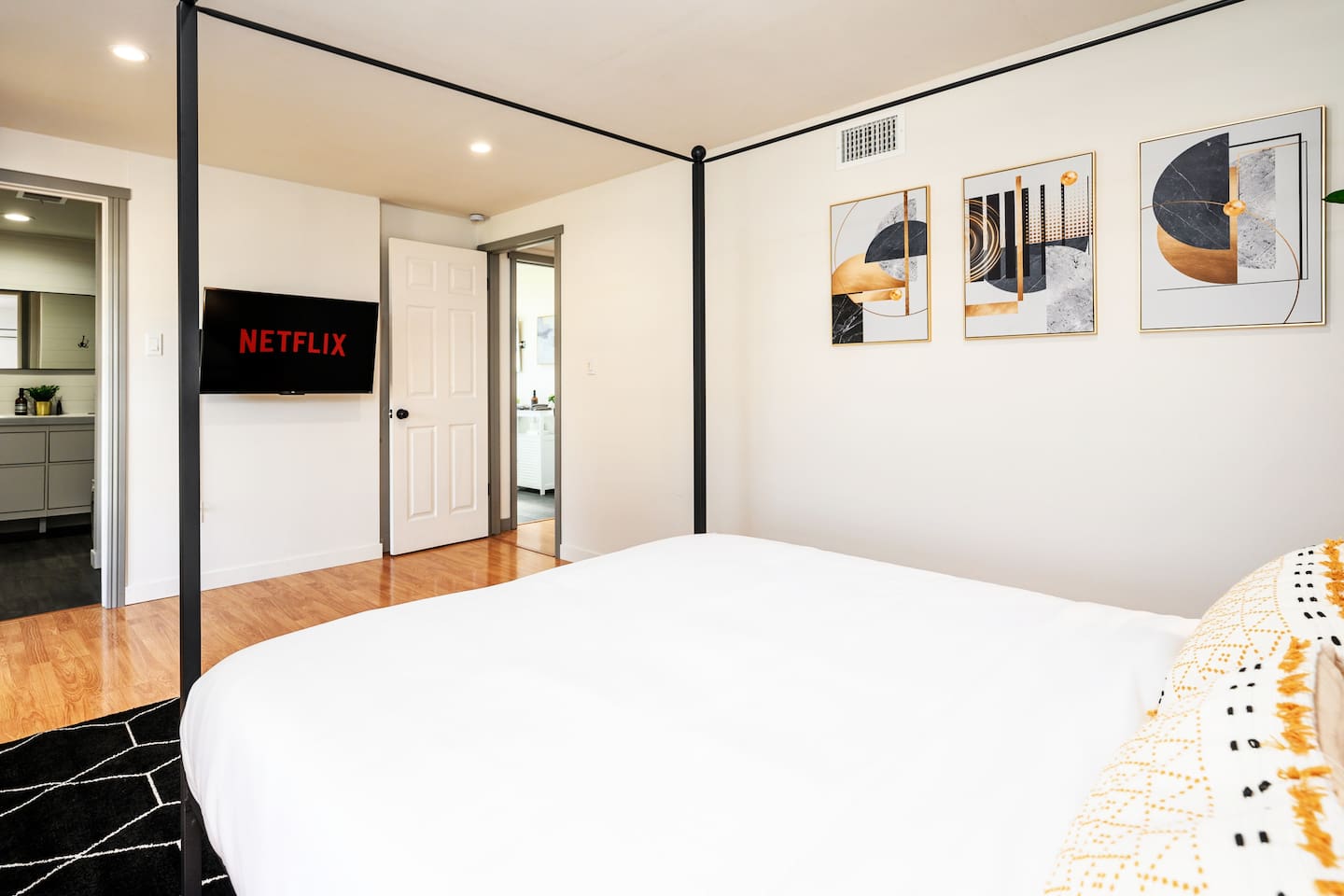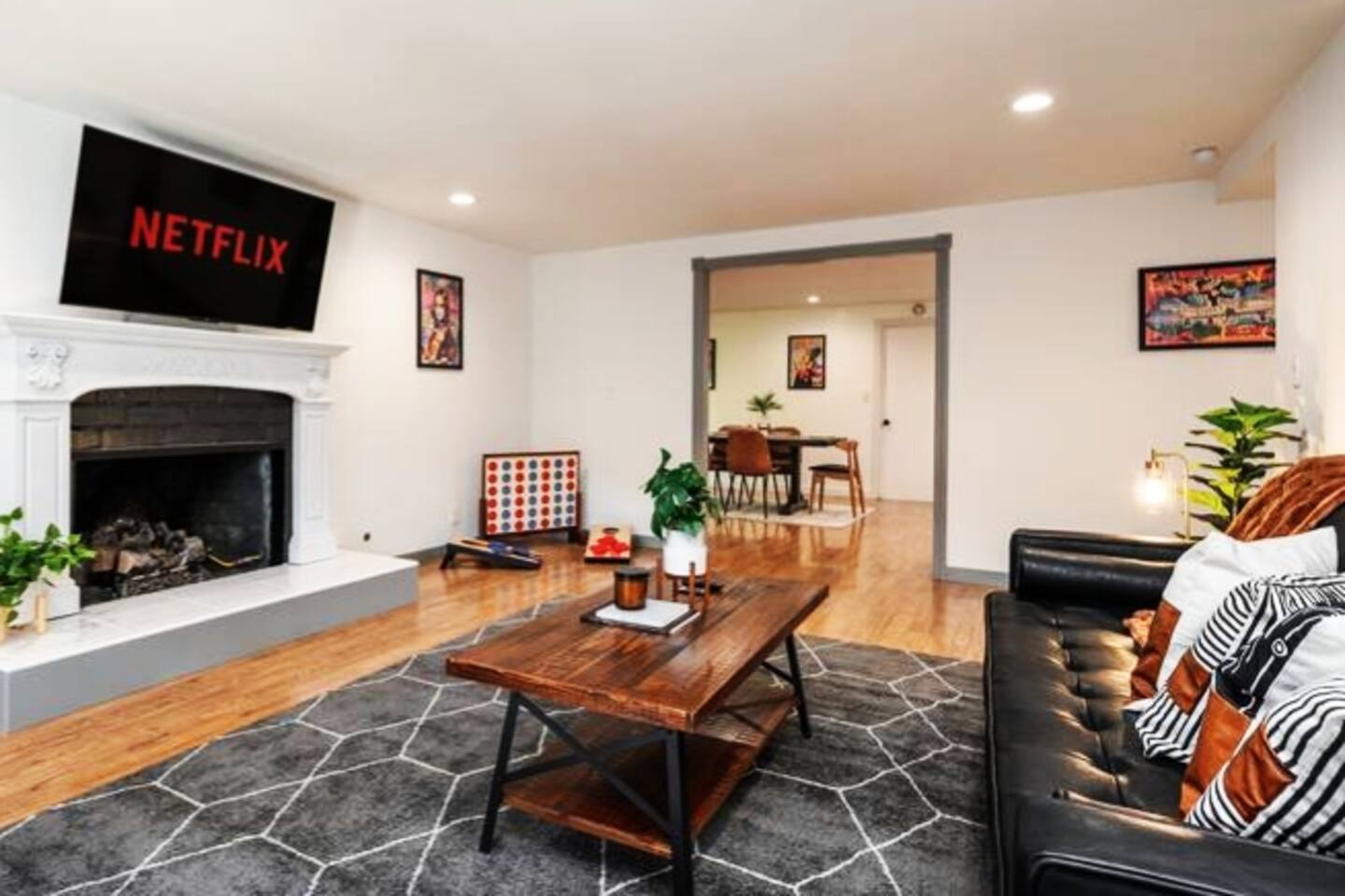Indulge in the elegance of this exquisite residence, exuding contemporary flair and ample space for the entire family to relish their own moments. Engage in timeless board games, spirited rounds on the arcade machine, or simply unwind with a glass of wine in the outdoor lounge—the epitome of warmth and hospitality awaits to craft lasting memories during your stay. ★ SPACIOUS LIVING ★ Unwind beside the fireplace in the luminous, expansive living area featuring a sumptuous leather sofa and two chic accent chairs. Enjoy endless entertainment with a Roku TV stocked with Amazon Prime Video, Apple TV, Disney+, HBO Max, Hulu, and Netflix (use your personal account), along with a playful arcade machine for youthful spirits. ✔ Plush Leather Sofa ✔ 65" Wall-Mounted Smart TV ✔ Stunning Fireplace ✔ Arcade Machine ★ GOURMET KITCHEN & DINING ★ The chef’s kitchen is a culinary haven, complete with a standalone oven, cooktop, and a generous fridge/freezer with filtered water and ice dispenser. Find top-quality cookware, dinnerware, and utensils, alongside a coffee maker for that perfect start to your day. Gather at the elegant dining table for six, doubling as a game center with a selection of board games and a full-size foosball table for lively competition! ✔ Stainless Steel Appliances ✔ Coffee Maker ✔ High-Quality Cookware & Utensils ✔ Dining for Six ✔ Board Games & Foosball Table ★ BEDROOMS & BATHROOMS ★ Discover four spacious bedrooms, each adorned with luxurious queen beds and floor mattresses topped with soft, high-quality linens. Unpack effortlessly with ample storage space. The two lavish bathrooms are stocked with essentials and plush towels, ensuring a pampered stay. ✔ Bedroom One – Queen Bed & Floor Mattress ✔ Bedroom Two – Queen Bed & Floor Mattress ✔ Bedroom Three – Queen Bed & Floor Mattress ✔ Master Bedroom – Queen Canopy Bed & Floor Mattress & Crib/Pack n Play ✔ Master Bathroom ✔ Central Family Bathroom ✔ Bath Towels ✔ Toiletries Provided ✔ Soap, Shampoo, Conditioner and Bodywash (McKesson Body Wash and Shampoo with Aloe) ★ OUTDOOR RETREAT ★ Bask in the Californian sun in the private grassy yard, relaxing under the shaded patio or engaging in giant connect 4 or cornhole. As twilight descends, gather around the fire pit for marshmallow roasting and captivating stories. ✔ Covered Patio ✔ Outdoor Lounge ✔ Cornhole ✔ Giant Connect 4 ✔ Fire Pit ★ PET POLICY ★ Bring along your furry companion for an additional fee. We warmly welcome one pet, requiring a one-time fee of $200. To ensure everyone's comfort, please ensure your pet is trained and does not shed or damage our furniture. Any damages will incur a replacement fee. Thank you for helping us maintain a delightful experience for all. Please add the pet in the guests count. Whether planning a family vacation or a Disneyland getaway just moments away, look no further than this chic, contemporary haven boasting unparalleled style and a plethora of amenities for an unforgettable stay.