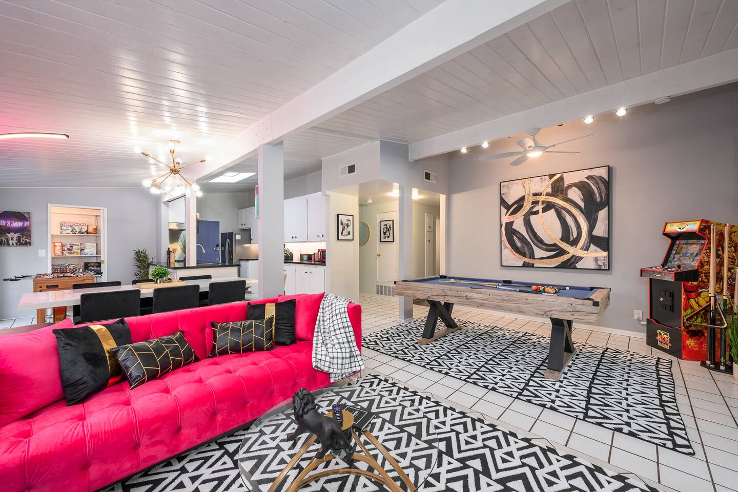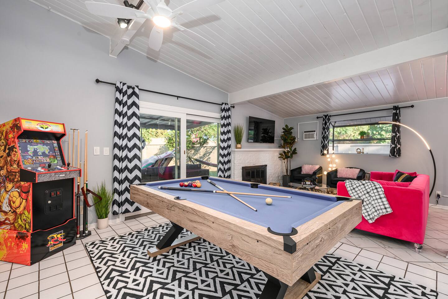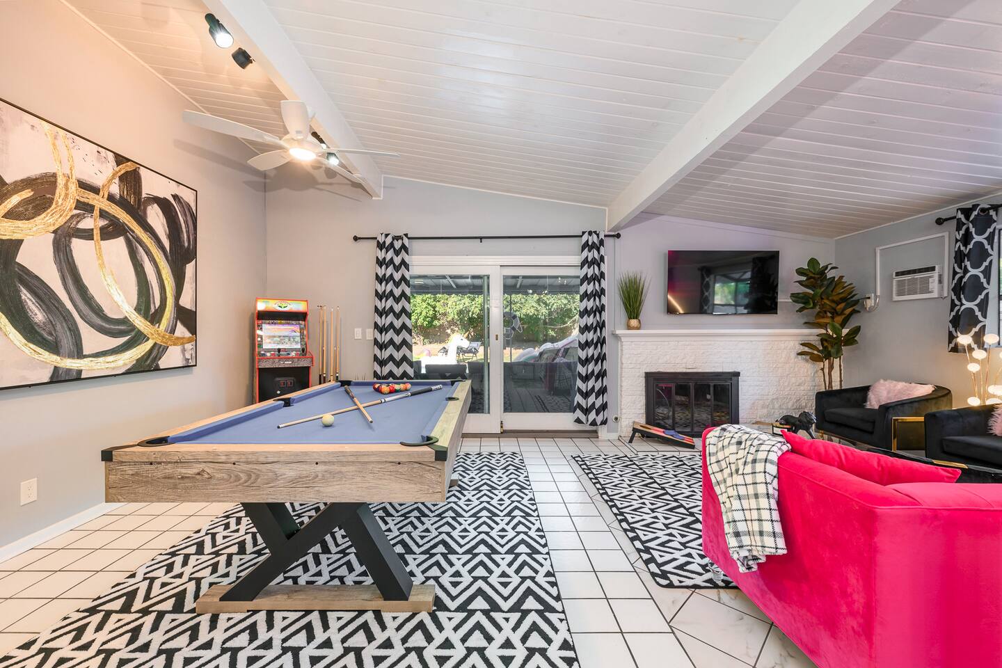 Check yourself in using the easy keyless entry and feel right at home with plenty of space for the whole family to spread out. You’ll have everything you could need for a fun and relaxing stay all just minutes from great shopping, dining, and entertainment giving you the perfect base to experience everything this beautiful part of California has to offer. Pet is allowed. Please check the bottom for more details. ★ LIVING AREA ★ Spend your afternoons gathered together in the spacious, open-concept living area where you can stream a movie on the 60” TV or snap some vacay photos up against the stylish Insta wall and be the envy of friends and family back home. For even more entertainment, you’ll find a selection of board games for fun family game nights as well as a full-size pool table for the adults. ✔ Chic Pink Sofa ✔ 60” TV with streaming apps ✔ Fun Insta Wall ✔ Arcade - 14 Games in 1, Street Fighter II Turbo: Hyper Fighting, Final Fight ✔ Boardgames ✔ Corn Hole ✔ Pool Table ★ KITCHEN & DINING ★ Move through into the modern kitchen that comes fully equipped to cook up stacks of pancakes in the mornings to delicious family dinners at night with quality appliances, sleek stone countertops, and all the cookware, dinnerware, and utensils you could need. Eat together at the stylish table set for eight or on a sunny Californian day, enjoy your meals alfresco style out by the pool under the shady patio. ✔ Stainless Steel Appliances (New fridge with filtered Ice and water) ✔ Toaster ✔ Microwave ✔ Bluetooth Speaker ✔ Rice cooker ✔ Coffee Maker - Coffee provided ✔ Elegant Dining for Eight ✔ Cookware, Dinnerware & Utensils ✔ Alfresco Outdoor Dining ★ BEDROOMS & BATHROOMS ★ After a day of fun and adventure, you’ll find 4 elegant bedrooms within the home giving everyone their own space to unwind. Each bedroom comes fitted out with cloud-like Tempurpedic beds, hotel-quality linen, AC to keep you comfortable, and plenty of room for you to unpack. The master bedroom is ideal for young families with a crib for the little one, a sparkling ensuite bathroom, a lavish king bed, and a smart TV so you can binge the latest series in style while tucked up in bed. Along with the master ensuite, there is a second full bathroom that comes stocked with all the essentials for your stay along with plenty of soft, fluffy towels for each guest. ✔ Master Bedroom – Tempurpedic Queen Bed and Hotel Grade Pillows ✔ Bedroom Two – Tempurpedic Queen Bed and Hotel Grade Pillows ✔ Bedroom Three – Tempurpedic Queen Bed and Hotel Grade Pillows ✔ Bedroom Four – Tempurpedic Queen Bed and Hotel Grade Pillows ✔ Central Family Bathroom ✔ Bath Towels ✔ Soap, Shampoo, Conditioner and Bodywash ★ OUTDOOR LIVING ★ When you need a break from Disney and the sights of the city, slide open the double glass doors, step out into the leafy backyard oasis, and spend lazy days relaxing by the pool or sipping a drink on the lounge. The spacious yard is ideal for entertaining giving you plenty of space for the kids to run around while you relax on the zero gravity loungers as you unwind under the shady patio and take it all in. ✔ Shady Patio Area ✔ Pool ✔ Outdoor Lounge ✔ Zero Gravity Chair ✔ Patio Seating with Umbrella ✔ Alfresco Dining ✔ Life-size Connect 4 game ✔ Solar-powered String Light ★ Pets Fee★ If you have a pet please make sure to add your pet to the guest count. We happily welcome only 1 pet with a one-time pet fee of $300. To ensure the comfort of all our guests, we kindly request that your furry friend is potty trained and does not shed or scratch our furniture. In the unlikely event that any damages occur, we will need to charge a replacement fee for the affected furniture which will be hundreds of dollars. Thank you for your understanding and cooperation in making our accommodations a pleasant experience for all. So if you’re looking for a fun, entertaining, and stylish place to call home for your next Californian adventure, for a group getaway, or for a couples retreat that gives you the perfect location to catch a game, eat out, ride the coasters at Knotts or don your Mickey ears at Disney, look no further than this chic, family-friendly Fullerton home – We can’t wait to host you!